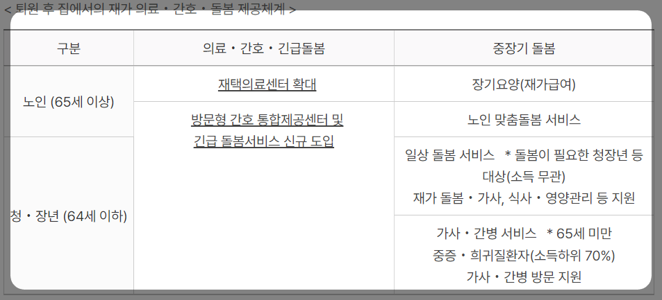 👉 재택 의료ㆍ간호ㆍ돌봄 서비스 지원: 퇴원 후 집에서도 의료ㆍ간호ㆍ돌봄 서비스를 받을 수 있도록 지원.