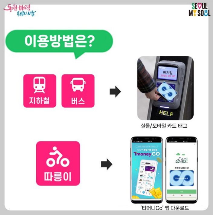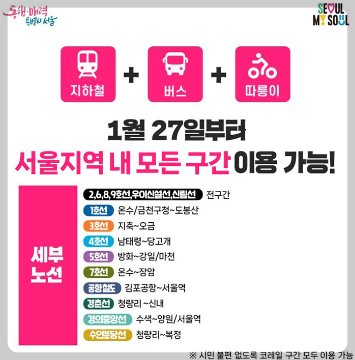 ✔️지하철 + 버스 + 따릉이 1월 27일 (첫차)부터 서울권 내 모든 구간 이용가능!