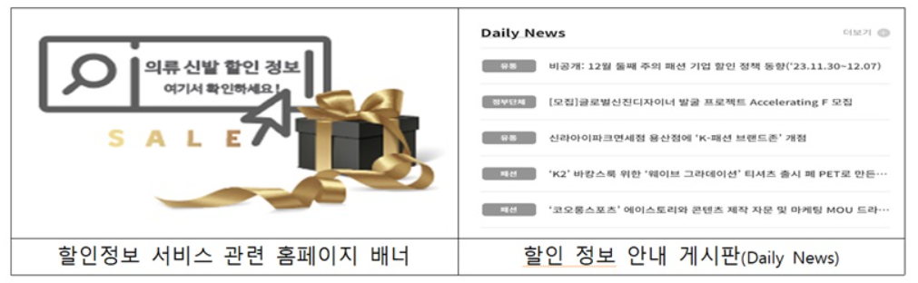 원재료 가격 및 인건비 상승 등으로 의류·신발 구매 비용이 커지자 합리적인 소비를 지원하기 위해 업계와 함께 할인 정보 안내 서비스를 제공하는 것이다.