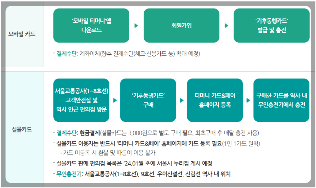 - 모바일카드는 안드로이드 운영체제 스마트폰에서 ‘모바일티머니’ 앱을 통해 다운로드 가능하며, 실물카드는 서울교통공사 1~8호선 역사 내 고객안전실에서 현금 3,000원에 구매할 수 있습니다.