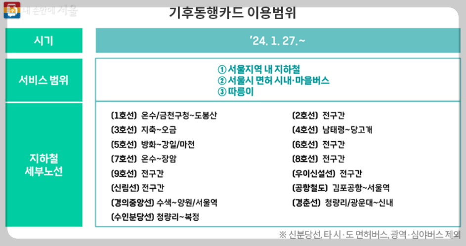 - 서울시 지역 내 시내버스, 마을버스, 지하철 1~9호선, 신림선, 우이신설선, 수인분당선, 경춘선, 경의중앙선, 공항철도 서울김포공항 구간에서 모든 지하철에서 무제한 이용 가능합니다.(경기 인천등 타 시, 도 면허버스, 광역버스와 심야버스는 제외)