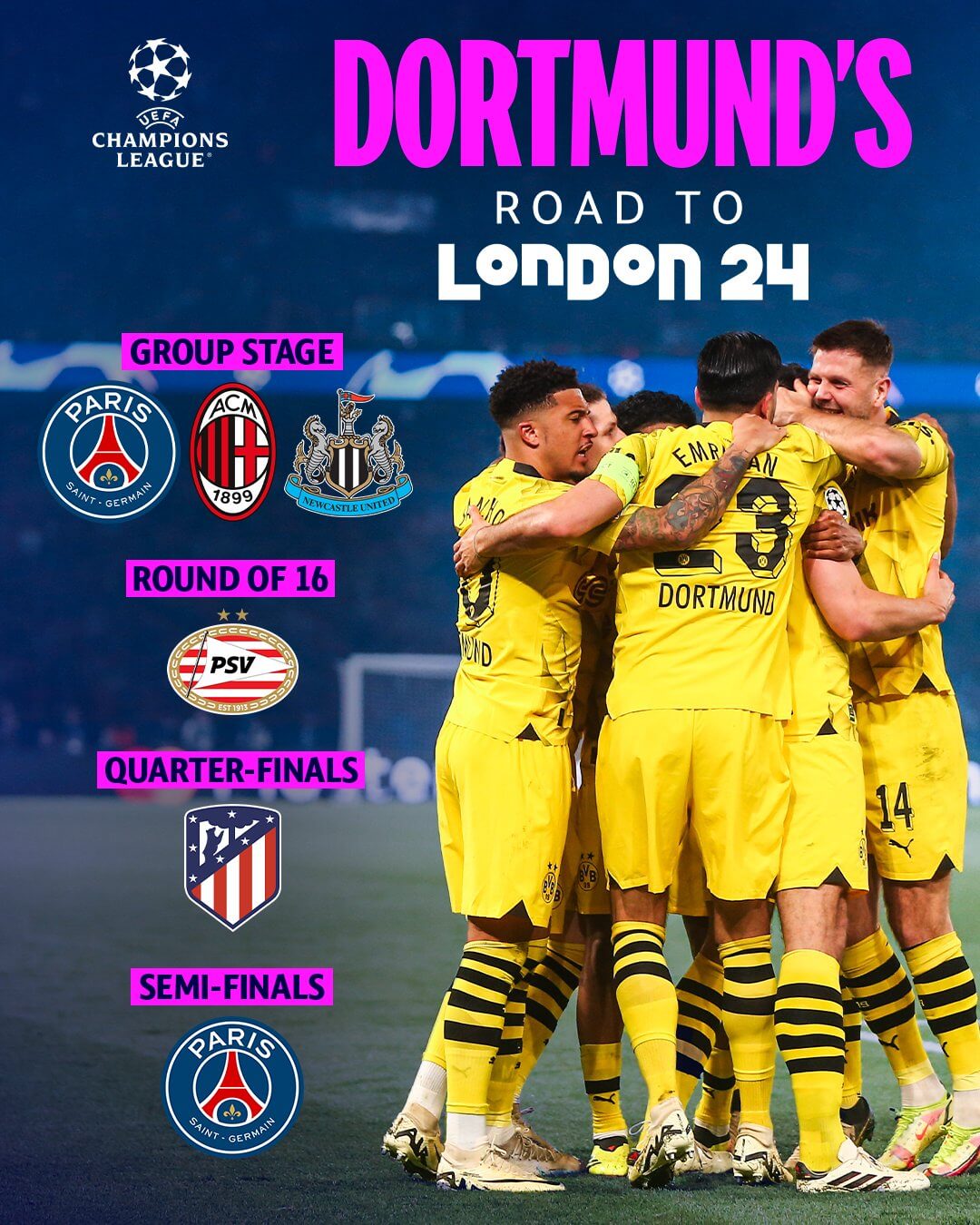 도르트문트는 1996~1997 시즌 이후 27년 만에 챔피언스리그 우승을 노렸습니다. 조별리그에서 F조 1위로 진출한 도르트문트는 PSV, AT마드리드, 파리 생제르망을 차례로 꺾고 결승에 올랐습니다. 이번 시즌 챔피언스리그에서 도르트문트는 총 12경기를 소화하며 7승 3무 2패의 성적을 기록했습니다. 도르트문트는 이전 결승전에서 패배의 아픔을 딛고 이번 결승전에서 새로운 역사를 쓰고자 했습니다.