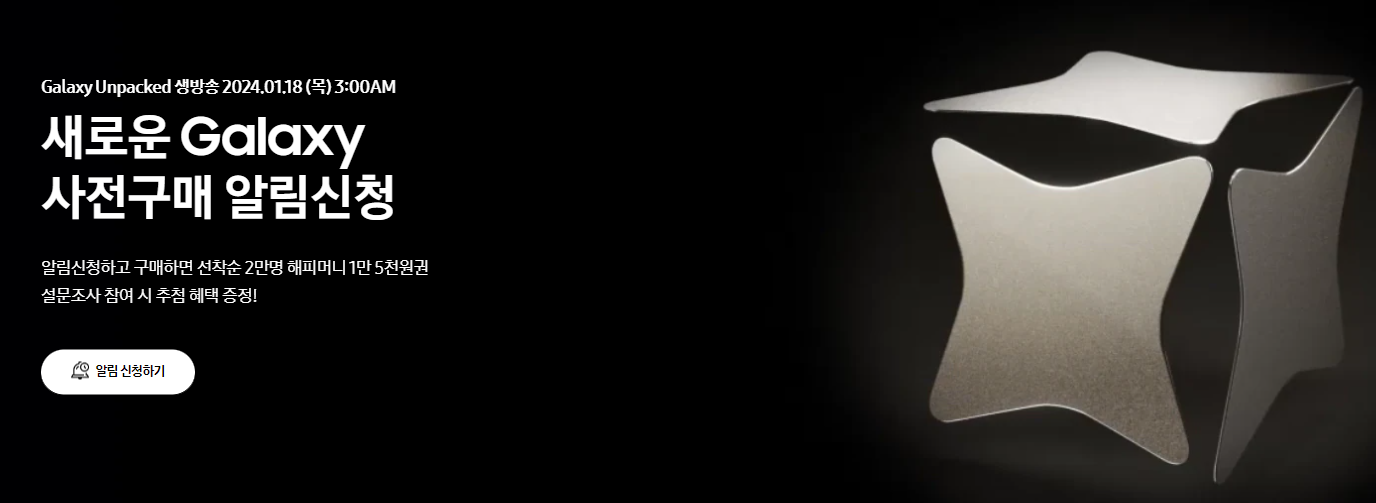 삼성전자는 갤럭시 S24, 갤럭시 S24+, 그리고 갤럭시 S24 울트라를 1월 17일(한국시간 1월 18일 새벽 3시) 첫 번째 언팩 2024 이벤트에서 공개할 것이라고 공식적으로 발표했습니다. 벌써부터 갤럭시 S24의 엄청난 사전예약 혜택들 쏟아지고 있는데요. KT몰의 경우 갤럭시워치 6 , 갤럭시 탭 A9을 무료증정 그 외 다양한 사은품들로 고객들을 마음을 사로잡고 있는데요. 이번 포스팅에서는 갤럭시 S24의 혁신적인 신기능과 사전예약 혜택 그리고 유럽에 공개된 예상가격을 포스팅하도록 하겠습니다. 사전혜택을 통해 다양한 상품들을 공짜로 가져가시길 바라요 ^^