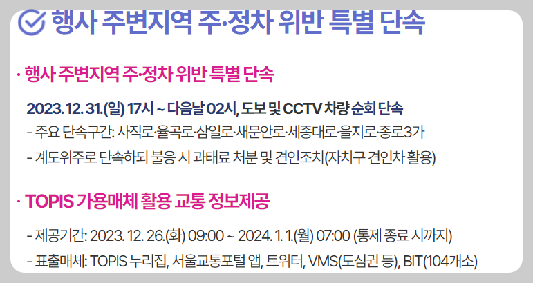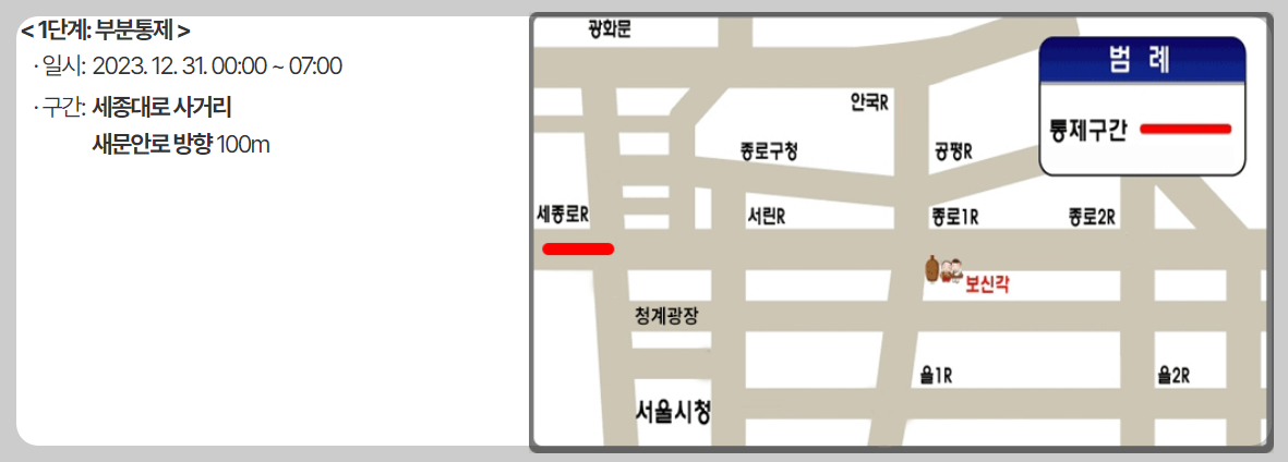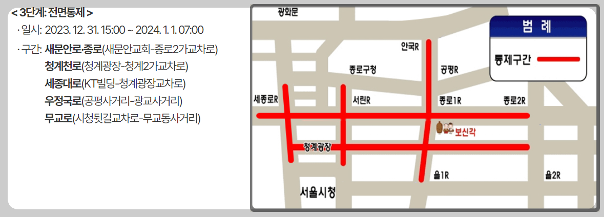 - 12월 31일 15:00부터 2024년 1월 1일 07:00까지 새문안로·종로(새문안교회-종로 2가 교차로), 청계천로(청계광장-청계2가교차로), 세종대로(KT빌딩-청계광장교차로), 우정국로(공평사거리-광교사거리), 무교로(시청뒷길교차로-무교동사거리) 구간.