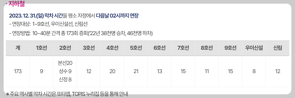- 12월 31일 막차 시간을 자정에서 다음날 02시까지 연장합니다. 연장 대상은 19호선, 우이신설선, 신림선이며, 1040분 간격으로 총 173회 증회 운행됩니다.