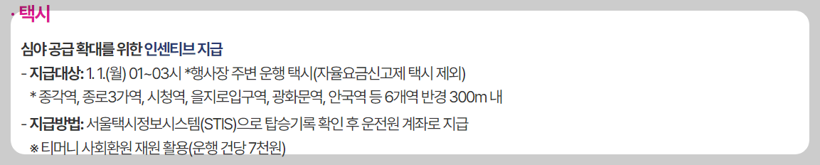 - 택시 심야 공급 확대: 행사장 주변에서는 1월 1일 01시부터 03시까지 택시 심야 공급이 확대됩니다. 이는 행사 참가자들의 편의를 위한 조치입니다.