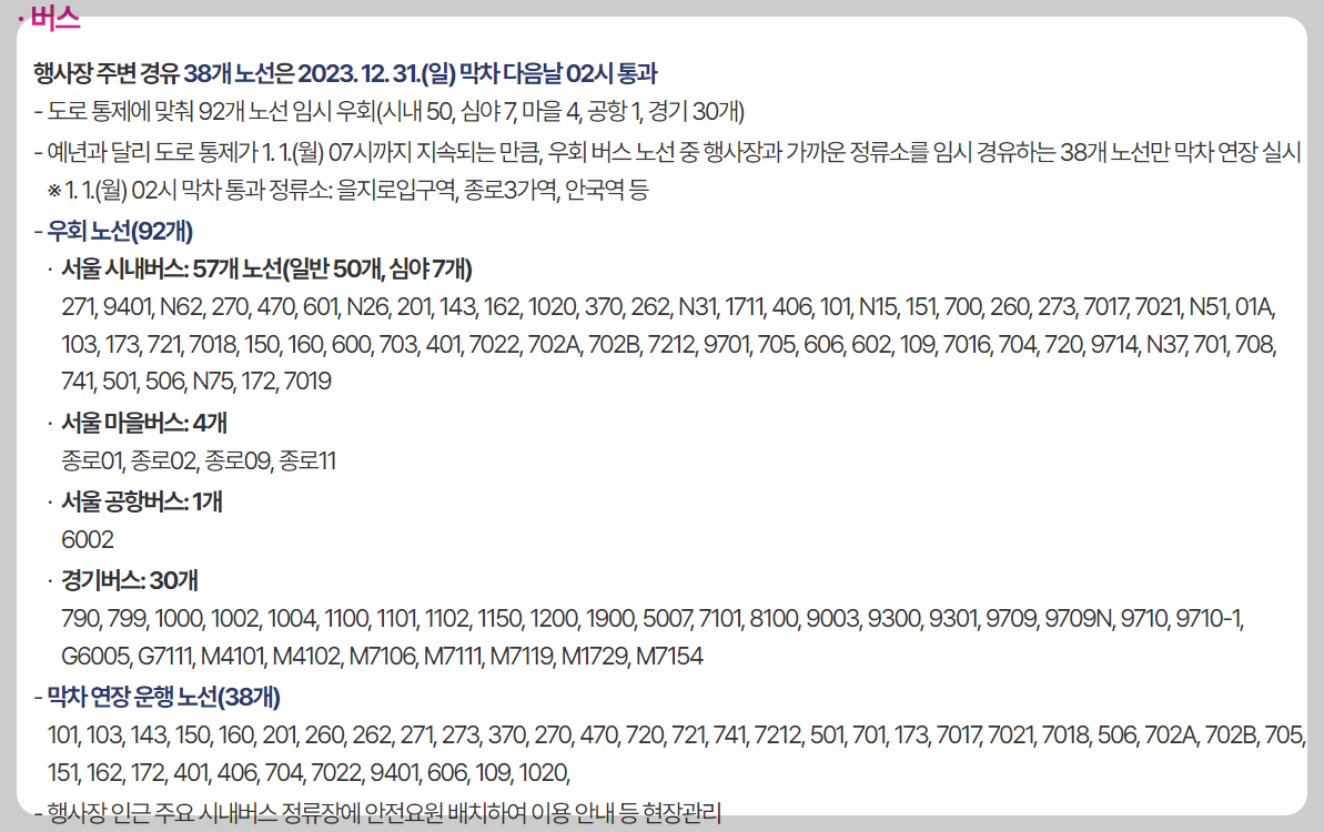 - 행사장 주변을 경유하는 38개 노선은 12월 31일 막차 다음날 02시까지 운행합니다. 이는 행사 참가자들이 안전하게 귀가할 수 있도록 하기 위한 조치입니다. 버스 노선의 연장의 자세한 내용은 위에 첨부 사진을 확인 바랍니다.