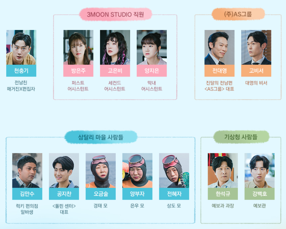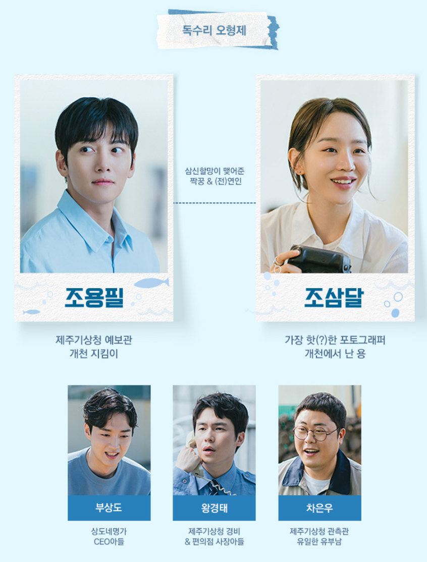 - 조용필: 지창욱이 연기하는 용필은 제주 기상청 기상예보 전담관입니다. 변함없는 충성심과 순수한 마음을 지닌 그는 어려서부터 조삼달을 짝사랑해왔다. 그의 삶은 일과 삼달에 대한 변함없는 애정을 중심으로 전개된다.