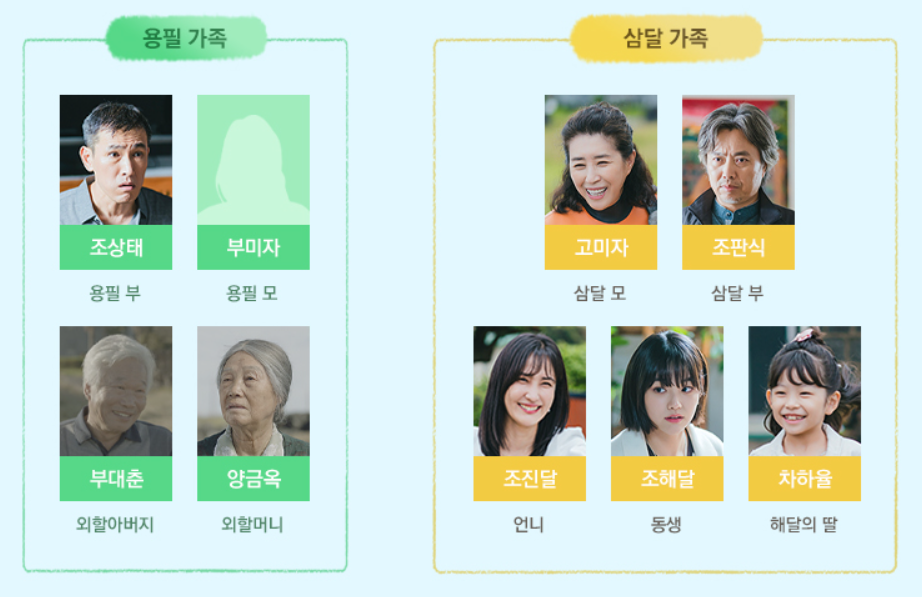 - 조삼달: 신혜선이 맡은 삼달은 자신의 꿈을 이루었지만 대가를 치르며 일류 패션 사진작가로 거듭나는 인물이다. 큰 좌절을 겪은 후 그녀는 고향으로 돌아와 오래된 불꽃을 다시 피우고 자신의 뿌리를 재발견합니다.