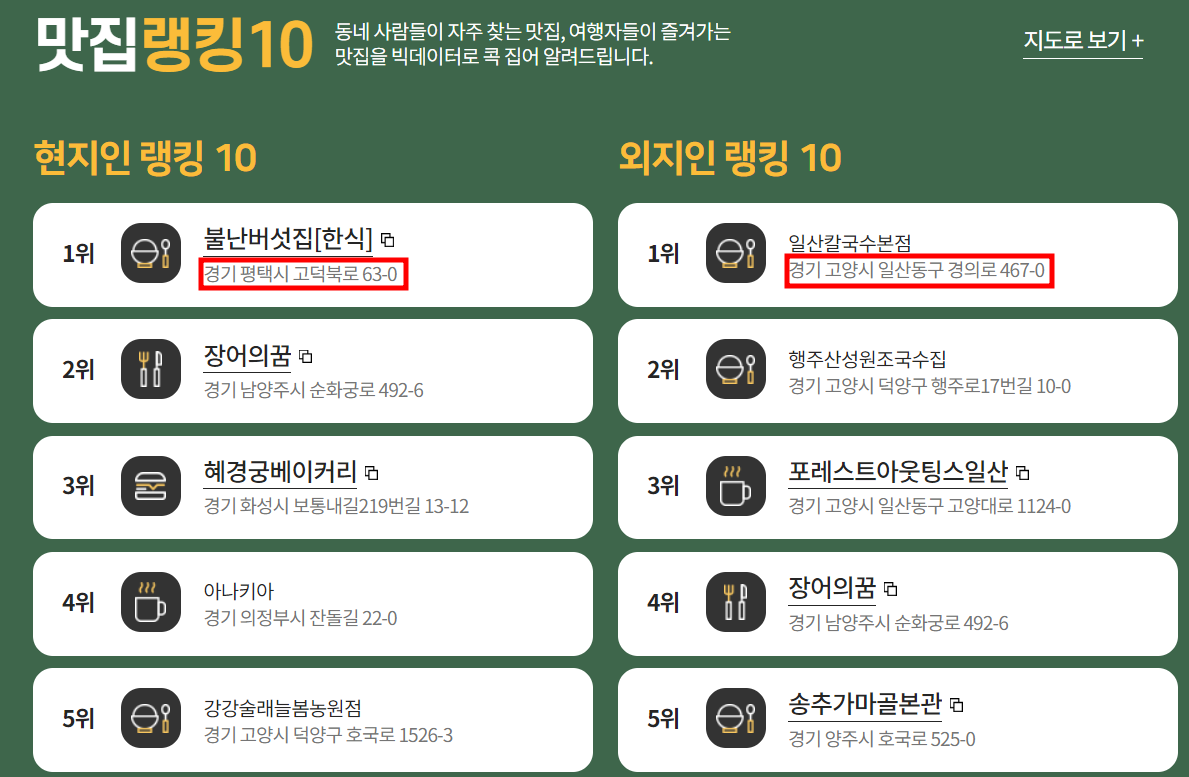 ➡️아래 화면과 같이 좌측에 큰 지도와 우측에 맛집랭킹10이 확인되실 거예요