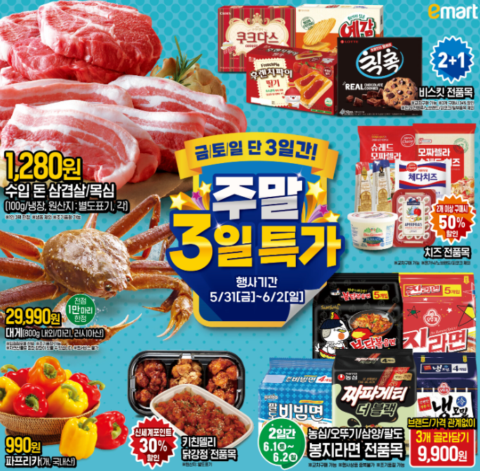 이번주 이마트, 홈플러스, 롯데마트의 5월 5째주 주말 장보기 할인 상품을 비교합니다. 이번 포스팅에서는 다양한 신선식품, 냉장 및 냉동식품, 가공식품, 주류, 간식, 주방용품, 가전제품 등 다양한 상품의 할인 정보를 제공하도록 하겠습니다.
