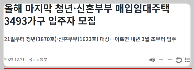 "대한민국 청년 및 신혼부부를 위한 저렴한 주택 설루션" 오늘은 대한민국 국토교통부가 청년과 신혼부부를 위해 저렴한 주택 기회를 제공하는 정책에 대해 알아보겠습니다. 대한민국 정부정책브리핑 홈페이지에서는 2023년 12월 21일 올해 마지막 청년·신혼부부 매입임대주택 3493 가구 입주자 모집 공고를 게시하였는데요. 자세한 내용은 아래 링크를 통해 확인 바랍니다.
