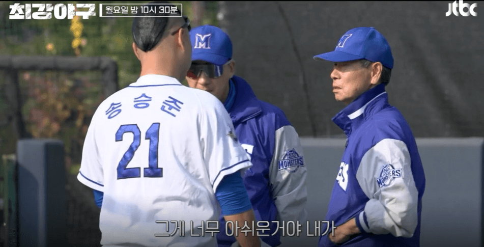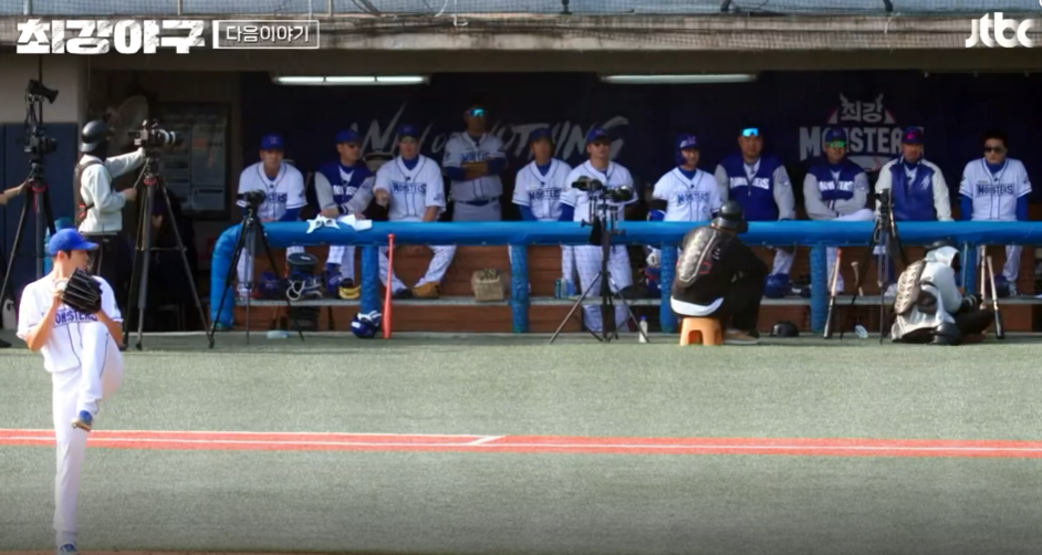 몬스터즈의 30번째 웜업, 이대호선수의 웜업을 물어보는 김성근 감독께 자신감을 내보이는 장면이 연출됩니다. 다음장면에서는 박용택선수의 컨디션이 좋다는 밝은 목소리로 말하자 김성근 감독은 머리카락이 빠졌다는 얘기로 경기 전 큰 부담감을 느끼고 있는 장면이 보였습니다.