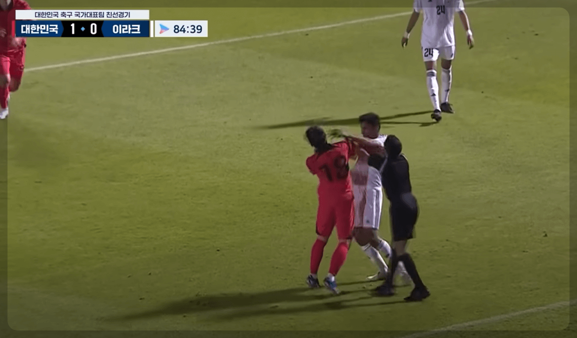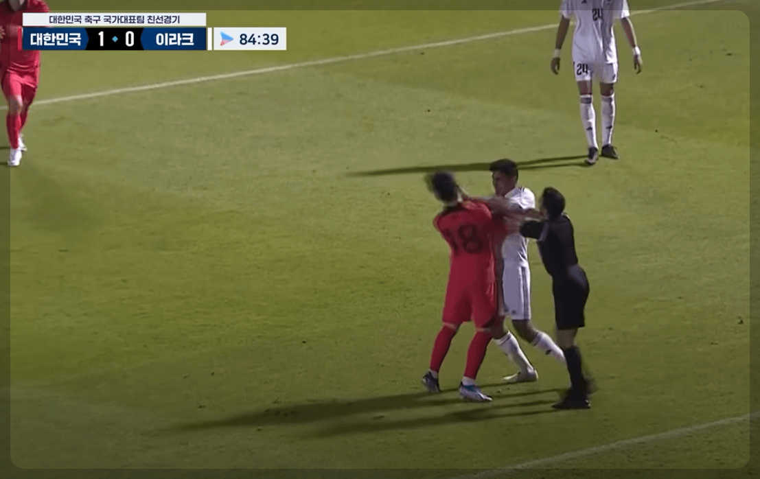 후반 39분에는 이강인과 이라크 선수 간의 충돌이 발생했습니다. 이강인은 얼굴을 강하게 밀쳐졌음에도 불구하고, 주심은 두 선수 모두에게 옐로카드를 부여했습니다. 이로 인해 이미 옐로카드를 받은 이강인은 퇴장당하는 상황에 이르렀습니다. 이러한 판정은 경기의 공정성에 대한 의문을 더욱 증폭시켰으며, 축구 경기에서 심판의 역할과 중요성에 대한 논의를 불러일으켰습니다. 사진과 같이 주심은 바로 앞에서 장면을 지켜보았습니다.