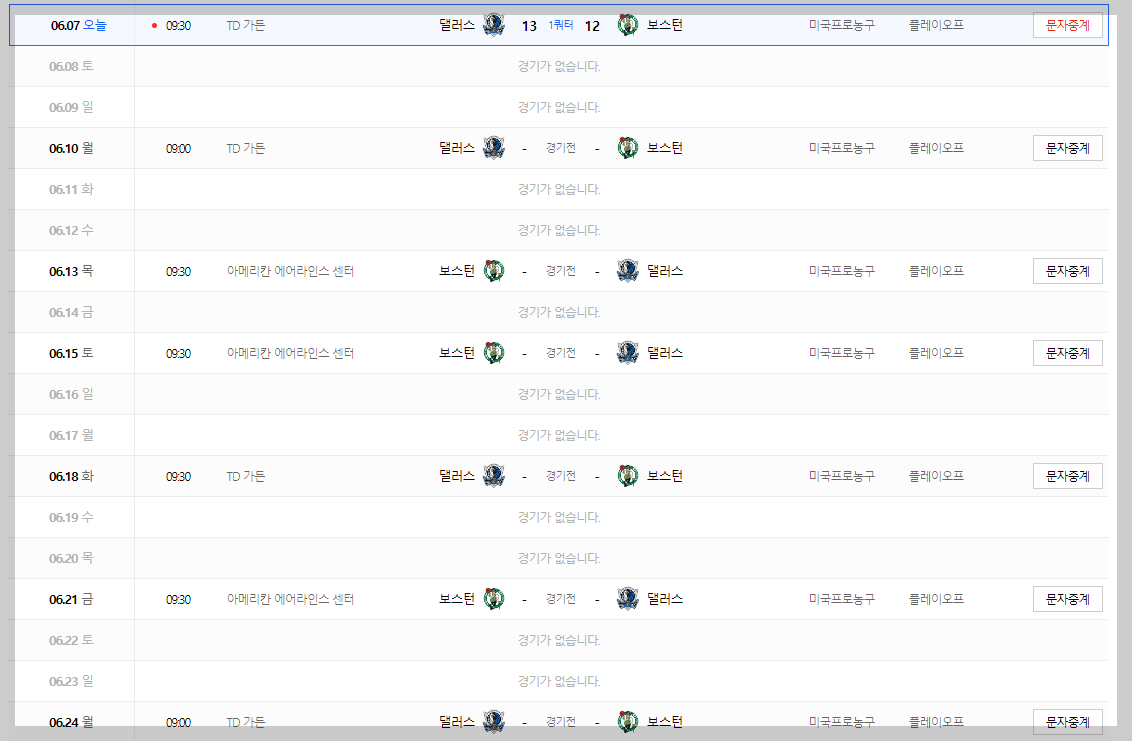 이제 남은 경기는 NBA 챔피언 결정전 보스톤 VS 댈러스의 경기만을 남겨놓고 있습니다.