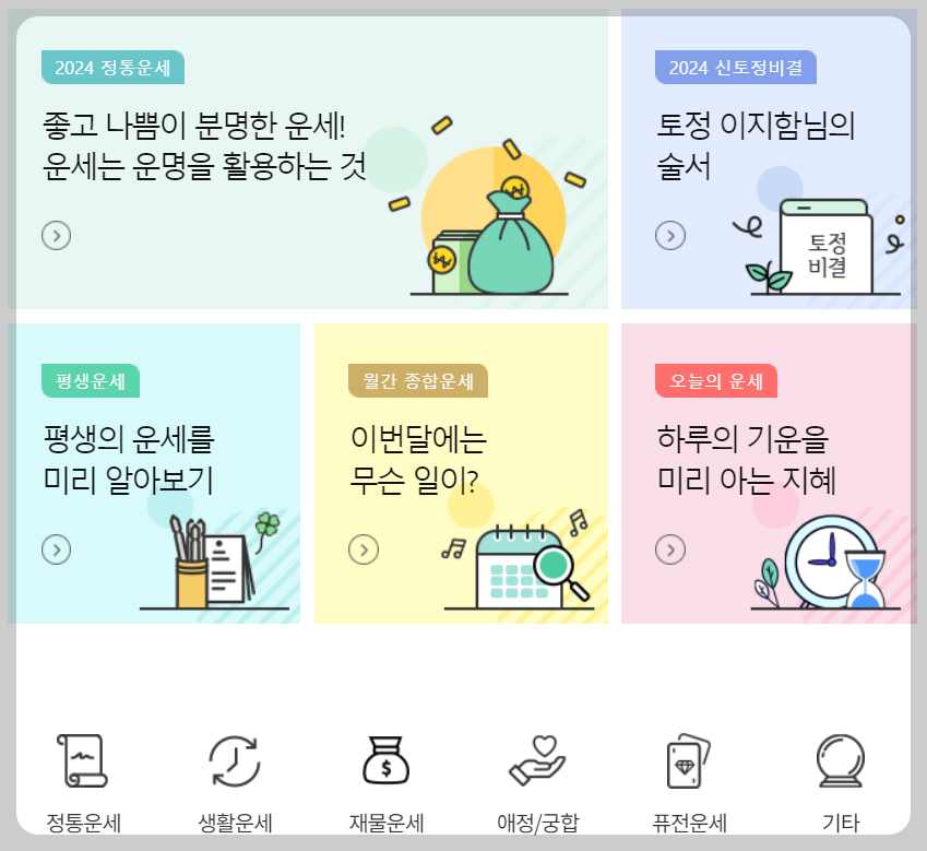 2024년 새해가 밝았습니다. 지난 2023년은 이제 기억의 저편으로 지나갔습니다. 새해 나의 금전운은 어떨까? , 올해는 결혼할 수 있을까? , 이번에는 승진해야 할 텐데.. 많은 이들이 앞으로 다가올 새해의 운세가 궁금할 것 같습니다. 그래서 이번 포스팅에서는 2024년 대박 터지는 신년운세를 무료로 볼 수 있는 3개의 사이트를 소개해드리려고 합니다. 자세한 사이트 소개는 아래 설명 해드리도록 하겠습니다. 오늘의 운세, 주간운세, 월간운세, 토정비결을 확인하러 가볼까요?