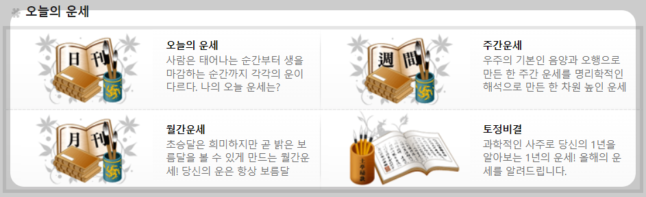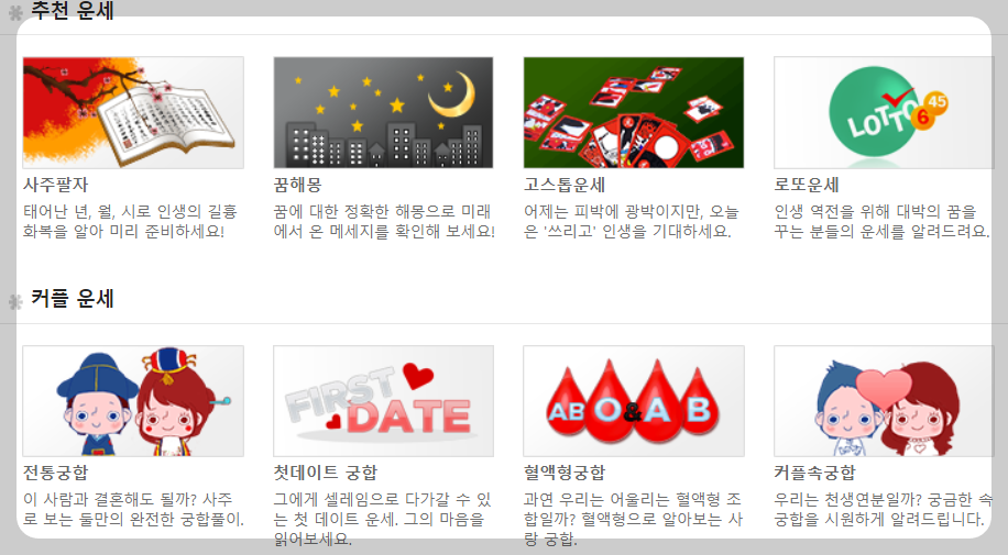 또한 추천운세로 사주팔자, 꿈해몽, 고스톱운세, 로또운세등을 볼 수 있으며 커플운세, 별자리운세등 다양하고 재미있는 콘텐츠가 무료로 준비되어 있습니다.
