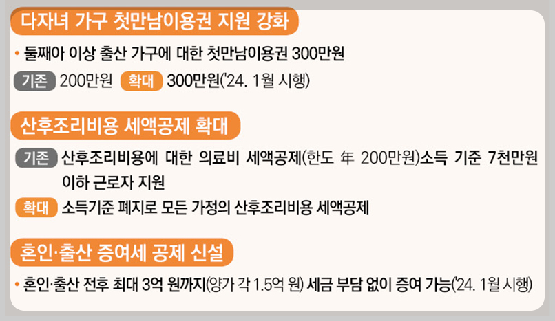- 산후조리비용에 대한 의료비 연 200만 원 한도 세액공제를 모든 소득 수준의 근로자에게 적용합니다.