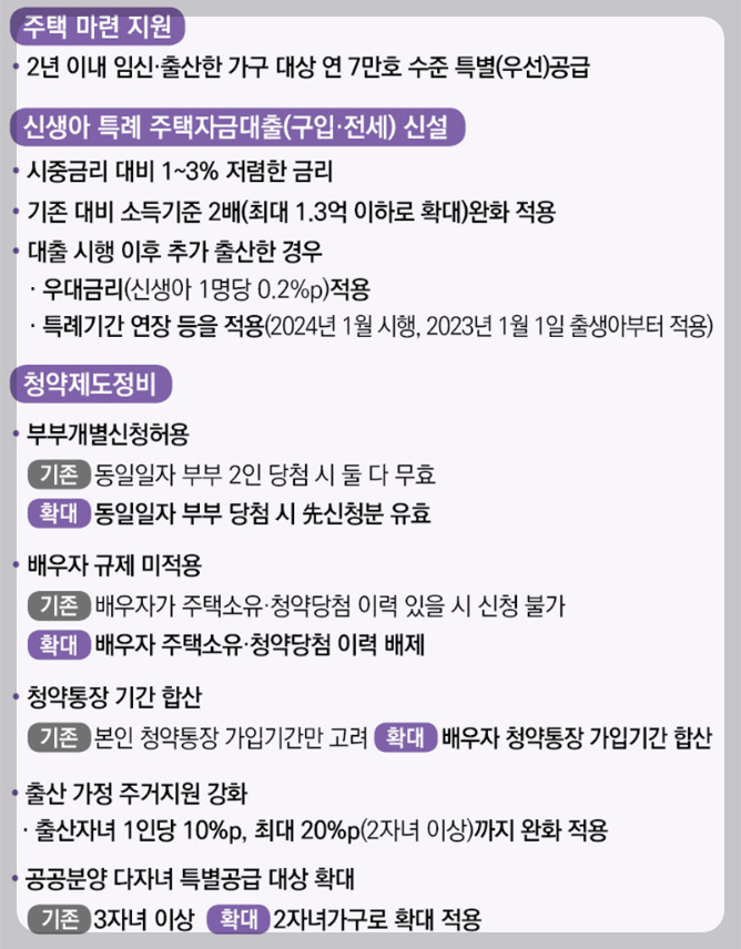 - 출산한 가구를 위한 저렴한 금리의 신생아 특례 주택자금대출을 신설하고, 대출 조건을 완화했습니다. 이는 젊은 가정이 주택을 마련하는 데 도움을 주어 가정의 안정성을 높이는 데 기여할 것입니다.