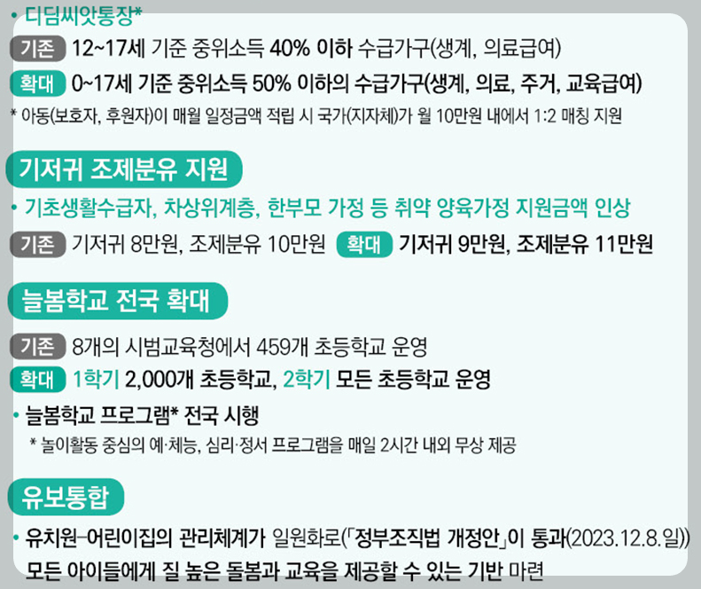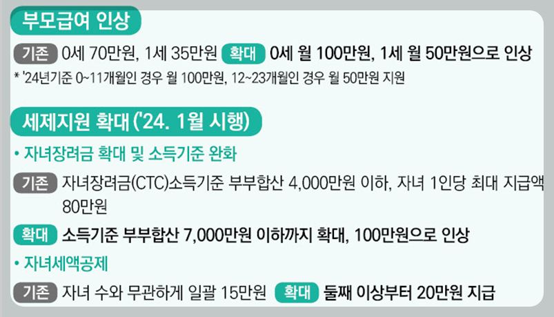 - 자녀장려금(CTC)의 부부합산 소득기준을 4,000만 원에서 7,000만 원 미만 가구까지 확대하고, 자녀 1인당 최대 지급액도 80만 원에서 100만 원으로 인상합니다.