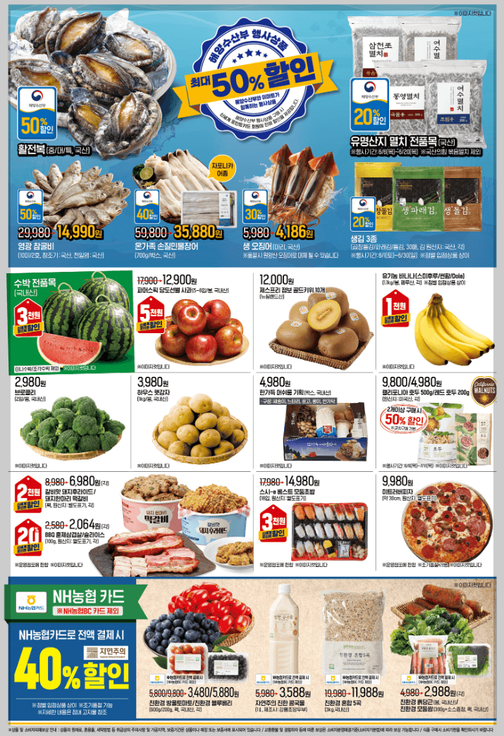 - 수산물: 활전복, 생오징어 등 20% 할인